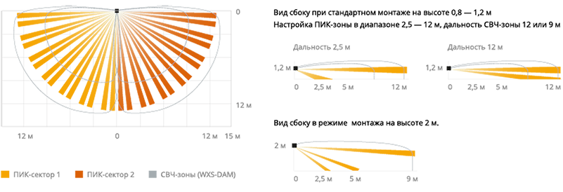 Режим высокого монтажа — 2 м используется в таких ситуациях, когда необходимо установить извещатель на нестандартной высоте для дополнительной защиты от вандализма и саботажа.